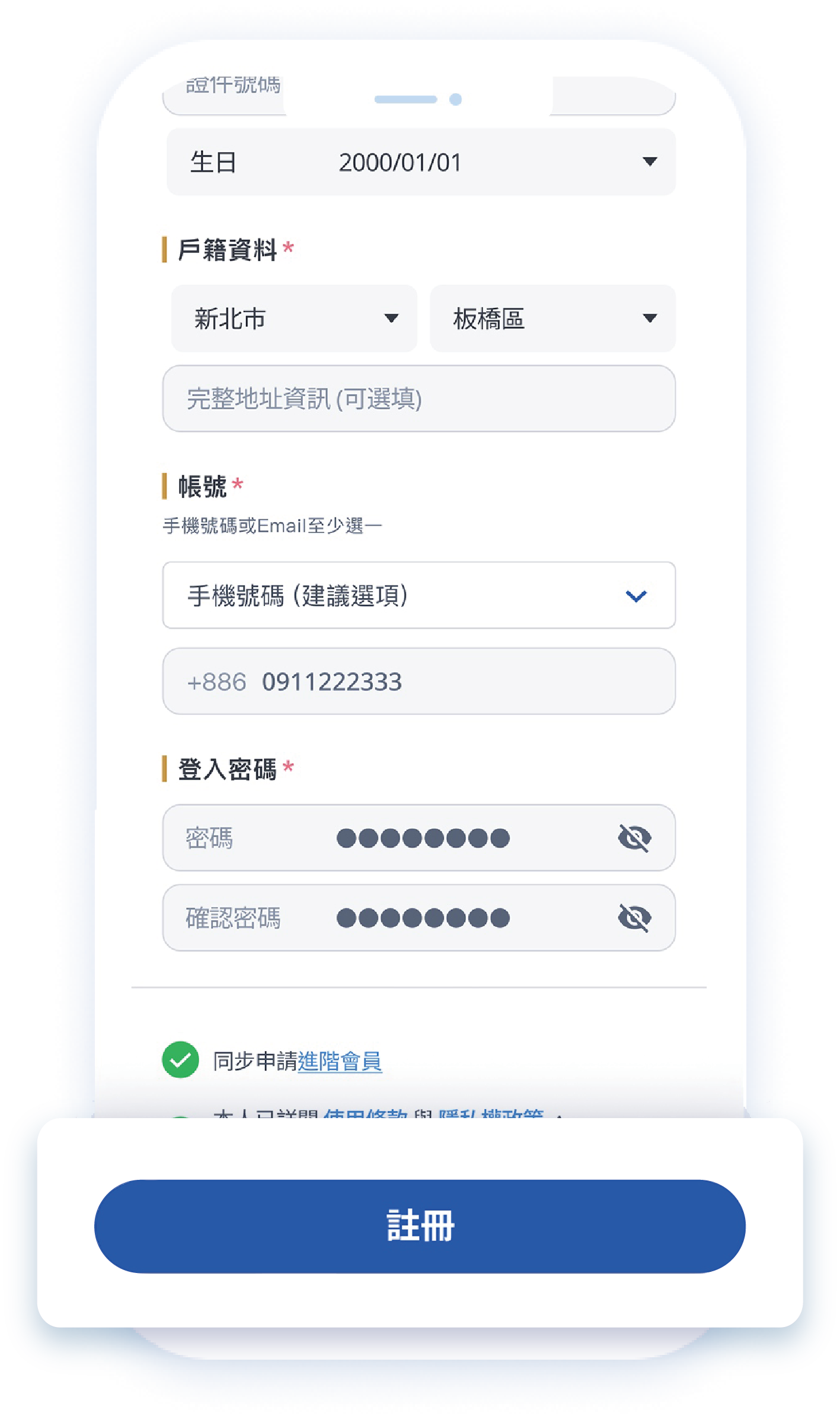 填妥所有必填資料後,請勾選同意使用條款,並點擊「註冊」完成申請